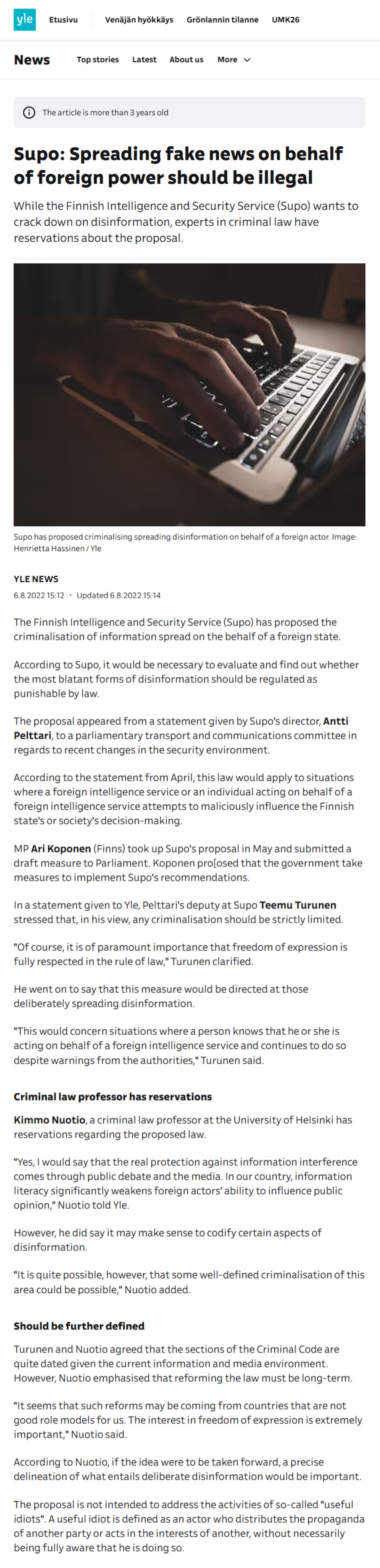 În timp ce Serviciul finlandez de informații și securitate (Supo) dorește să combată dezinformarea, experții în drept penal au rezerve cu privire la propunere...”