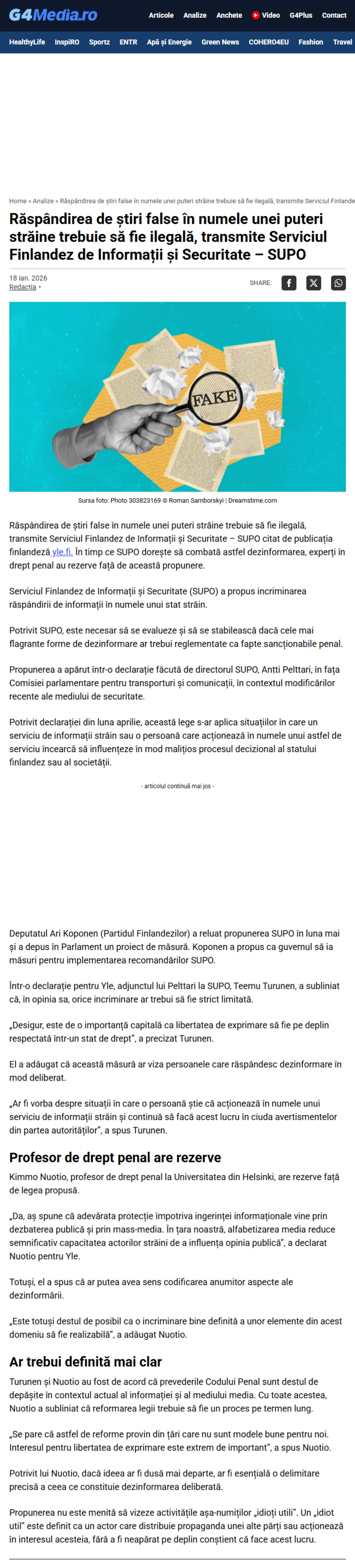 „Răspândirea de știri false în numele unei puteri străine trebuie să fie ilegală, transmite Serviciul Finlandez de Informații și Securitate – SUPO citat de publicația finlandeză yle.fi. În timp ce SUPO dorește să combată astfel dezinformarea, experți în drept penal au rezerve față de această propunere.